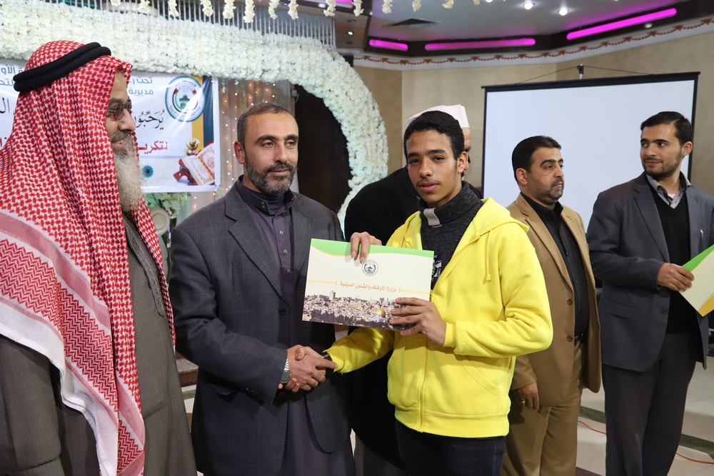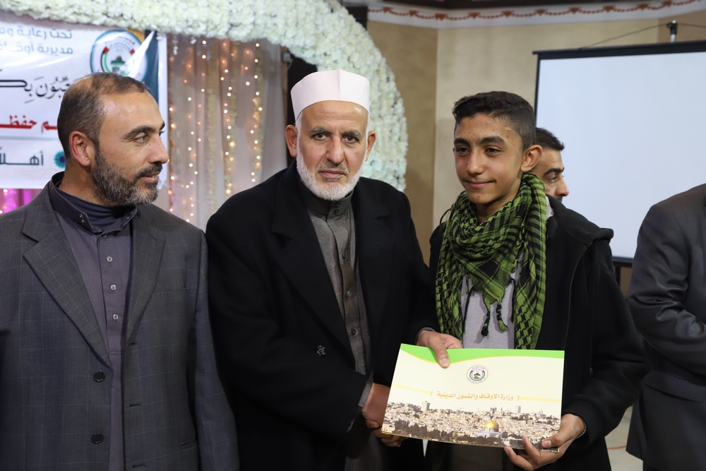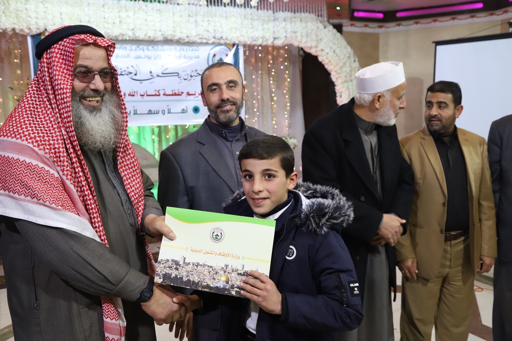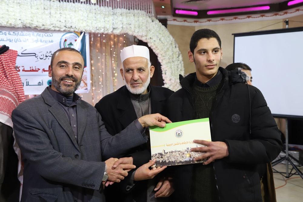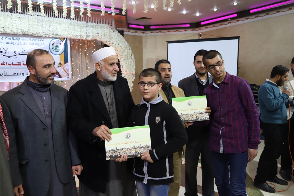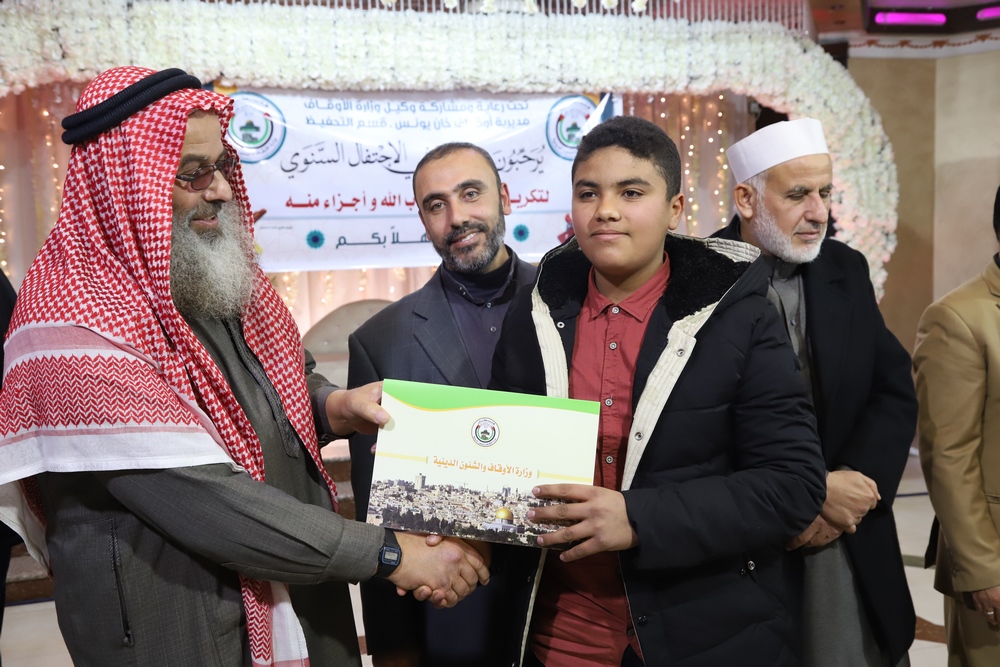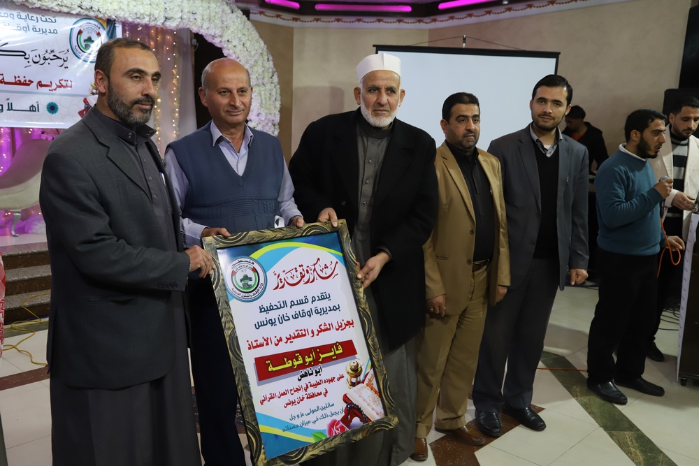 عقد قسم التحفيظ بمديرية أوقاف خانيونس احتفالاً لتكريم المحفظين المميزين وحفظة كتاب الله بحضور النائب في المجلس التشريعي الشيخ الدكتور يونس الأسطل ووكيل وزارة الأوقاف الدكتور عبد الهادي الأغا ومدير عام التحفيظ الأستاذ مازن النجار أبو مالك ومدير أوقاف خانيونس الدكتور محمد صالح الغلبان ورئيس قسم التحفيظ الشيخ عبد الباسط الأسطل وموظفي المديرية ولفيف من المواطنين..