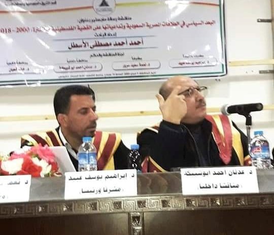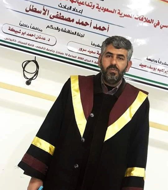 جامعة الأقصى/ غزة: بفضل الله وتوفيقه حصل الباحث الأستاذ الفاضل/ أحمد أحمد مصطفى"مطاوع" الأسطل على درجة الماجستير في الدبلوماسية والعلاقات الدولية من جامعة الأقصى، عن رسالته الموسومة بعنوان: