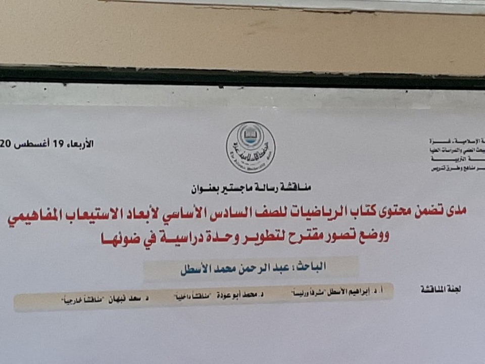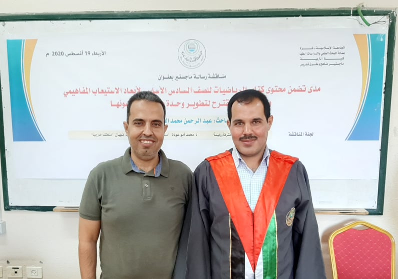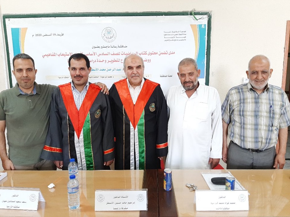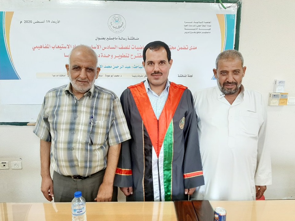 غزة - الجامعة الإسلامية حصل الأستاذ عبدالرحمن محمد محيي الدين "فايز" الأسطل يوم الأربعاء الموافق 19 أغسطس 2020 على درجة الماجستير في المناهج وطرق التدريس من كلية التربية بالجامعة، وذلك عن رسالته الموسومة بـ: