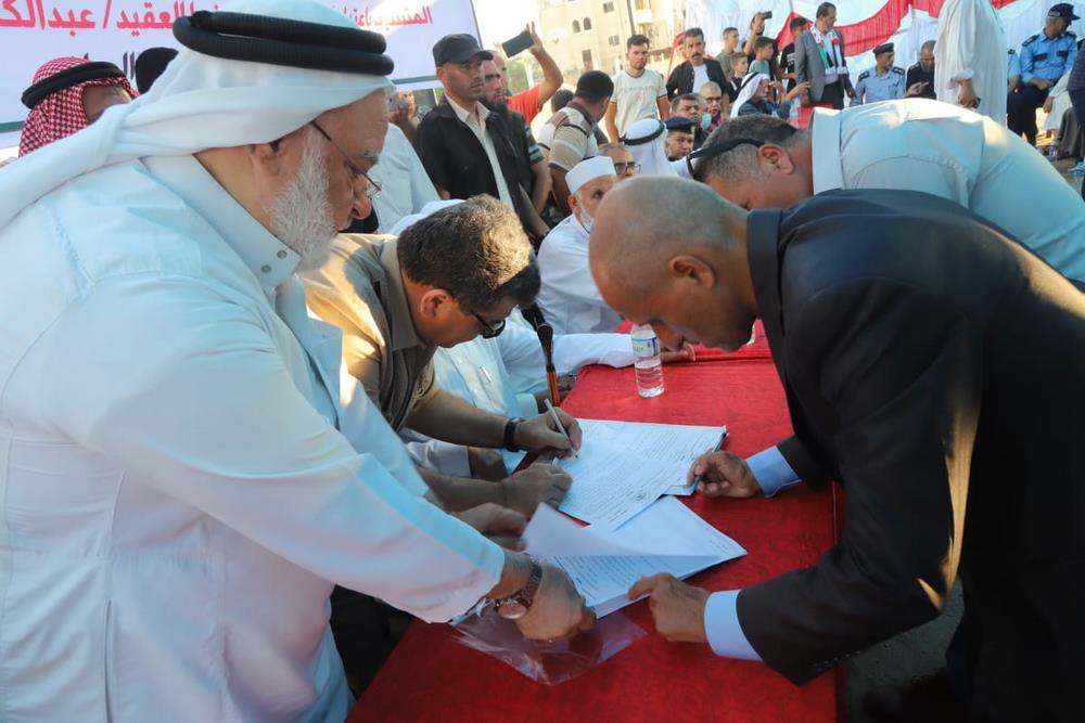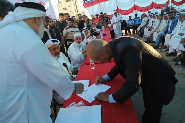 والسلم المجتمعي؛ سيما وأن العدو يسعى لإذاعة الفوضى في المجتمع، وفي نهاية الجاهة قام د. سالم سلامة بتلاوة عقد العفو على مرأى من الجميع ،وتوقيع الطرفان عليه.