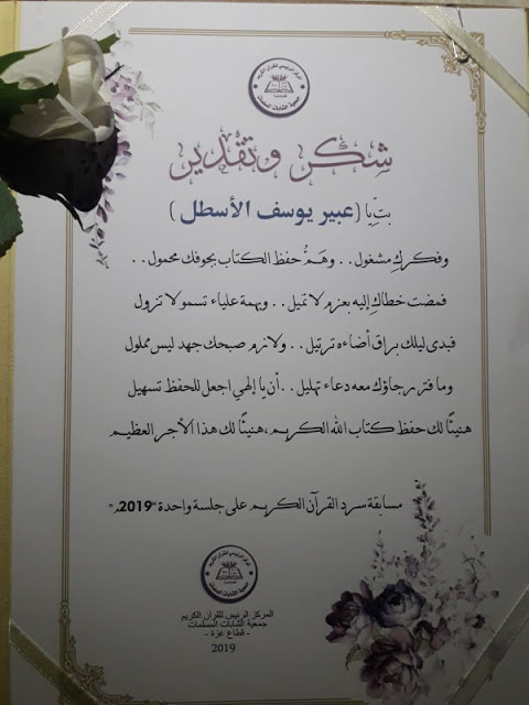 خان يونس الربوات / بفضل الله وتوفيقه حصلت الحافظة عبير يوسف قاسم "مطاوع" الأسطل على المركز الأول على القطاع بمساقة قرآنية نظمت للحافظات لكتاب الله تعالى بجمعية الشابات المسلمات حيث تمكنت الحافظة عبير من تسميع القرآن الكريم كاملا في جلسة واحدة من الثامنة صباحا إلى الخامسة عصرا وحصلت على معدل 97.4