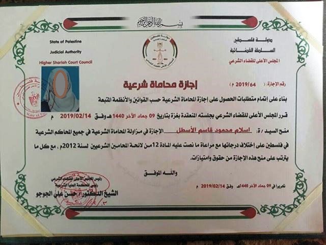 خان يونس / السطر الغربي : حصلت الأستاذة الفاضلة إسلام محمود قاسم "منصور" الأسطل على إجازة ممارسة مهنة المحاماة في المحاكم الشرعية في فلسطين .